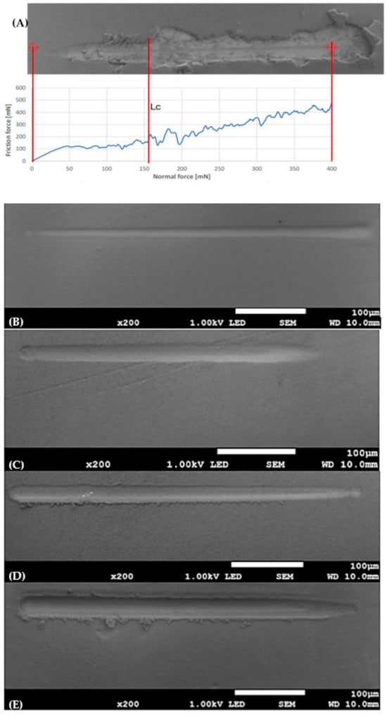 (A) Nanoscratch test curves for hydroxyapatite coating (nHAp20/5) with marked delamination force (Lc), and SEM images of (B) nHAp10/2, (C) nHAp10/5, (D) nHAp20/2, and (E) nHAp30/2.