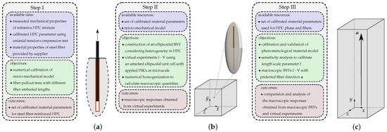 Graphical representation of the step-by-step approach: representative boundary value problems (BVPs) (a) fiber pullout test in step I, (b) virtual experiments in step II and (c) macroscopic BVPs in step III.