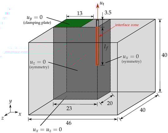 Boundary value problem for steel-fiber pullout tests based on the experimental assembly, adopted from [68]. All dimensions are in mm.