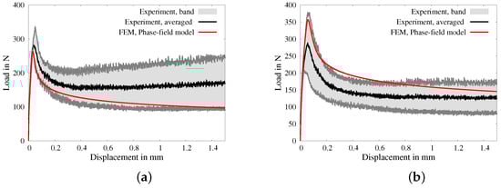 For the validation of the numerical model, a steel-fiber pullout test with an embedded length of is simulated using the same set of parameters. The simulations of the fiber pullout test for an embedded length of fiber and are discretized with 29,889 and 54,366 elements, respectively. The resulting load–displacement diagrams for simulations with an embedded length of and are compared with experimental data in Figure 3a and Figure 3b, respectively. Therein, the experimental data are depicted through the averaged curves and their corresponding scatter bands, taken from [66]. The results for simulations with an embedded length of and fit into the respective experimental band, see Figure 3.