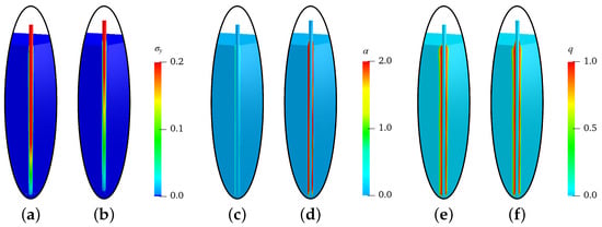 In Figure 4 and Figure 5, the distributions of stresses in the y-direction (in GPa), equivalent plastic strains and the phase-field parameter q at the displacements of mm and mm for the simulations of steel-fiber pullout tests with an embedded length of and are shown, respectively. For the both solutions, the stresses in the fiber at mm are higher than those at mm, compare Figure 4a,b and Figure 5a,b. This is because the fiber stress reduces after debonding of the interface zone, i.e., after evolution of damage in the interface zone. The evolution of equivalent plastic strains from the initial stage, i.e., at mm, to the later stage, i.e., at mm, can be observed in Figure 4c,d and Figure 5c,d. The damage initiates in the initial stage, i.e., at , due to the shear band in the complete interface zone, then it evolves in the later stages, e.g., at , depending on the evolution of the equivalent plastic strains , see Figure 4e,f and Figure 5e,f. This shows the capability of the presented numerical model to predict the evolution of damage due to plasticity. For details on the different stages of fiber pullout tests, refer to [68].