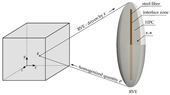 To distinguish between the quantities at macro- and micro-scales, the macroscopic quantities are denoted by an overline . An ellipsoidal RVE containing the fiber and the HPC matrix is considered. This RVE is attached at each material point at the macroscale. The boundary conditions at the microscale are derived using the Hill–Mandel condition, cf. [82,83]. The basic idea is to drive RVEs at the microscale by applying macroscopic strains and compute the microscopic field quantities, i.e., the strain and stress . Here, an elasto-plastic phase-field model using the Drucker–Prager plasticity formulation, illustrated in Section 2, is taken into account for computations at the microscale. The macroscopic quantities, e.g., stress , are computed from the volume averages of their microscopic counterparts. The concept of the homogenization approach is illustrated in Figure 6.
