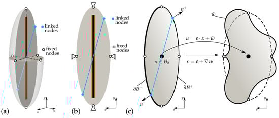where equal fluctuation of deformation, opposing traction vectors and opposing normal vectors at associated points are denoted by the symbols , and , respectively. Figure 7 describes the applied periodic boundary conditions. In Figure 7a, the fixed nodes at the highest and lowest point along the y-axis and the nodes on the x-axis and z-axis at the boundary of the middle plane are shown using blue dots. In Figure 7b, for the application of periodic boundary conditions, the ellipsoidal RVE is discretized with exact point symmetry on the lateral surface. A more general concept for applying periodic boundary conditions can be found in [84]; generalized boundary conditions on RVEs are discussed in [85].