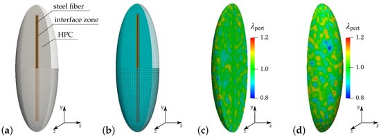 The representative volume element (RVE): (a) components of an ellipsoidal RVE and (b) a discretized ellipsoidal RVE used in the simulations, distribution of perturbation parameter for the consideration of heterogeneity in the concrete phase of an ellipsoidal RVE, (c) a cross-sectional view and (d) a front view of the ellipsoidal RVE used in the simulations, adopted from [89].