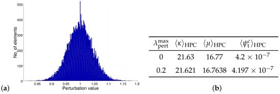 Consideration of inhomogeneity in the concrete phase of the ellipsoidal RVE: (a) histogram for perturbation of material parameters of HPC and (b) comparison of the computed volume averages of perturbed material parameters of HPC, taken from [89].