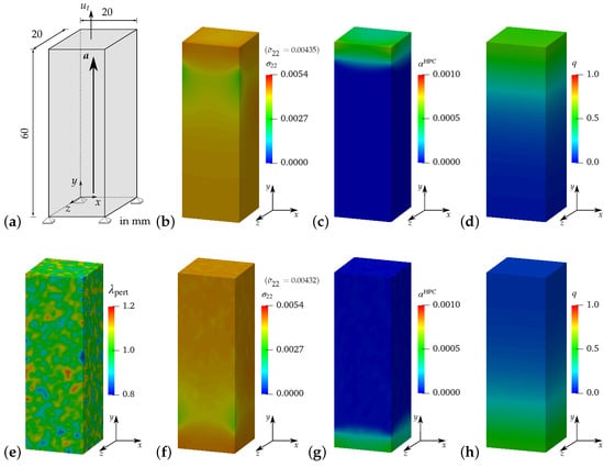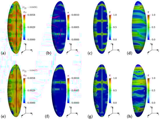 The results of simulations of virtual experiment I using reinforced ellipsoidal RVEs without perturbation of HPC parameters at macroscopic stress GPa, see Figure 11a–d, and with perturbation of material parameters at macroscopic stress GPa, see Figure 11e–h, are shown at a macroscopic strain of . Therein, the distribution of microscopic stress in the y-direction in GPa, see Figure 11a,e, the microscopic equivalent plastic strain , see Figure 11b,f, and the microscopic phase-field parameter q in cross-sectional view, see Figure 11c,e, and in front view, see Figure 11d,h, can be compared to analyze the effect of the considered heterogeneity. For example, the phase-field parameter q in Figure 11g is not symmetrically distributed as compared to the distribution in Figure 11c.