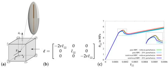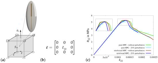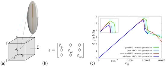 Virtual experiment III: uniaxial tensile test with transverse compression: (a) boundary value problem (RVE), (b) macroscopic strain tensor applied to RVE and (c) comparison of macroscopic stress–strain characteristics using pure and reinforced ellipsoidal RVE without perturbation and with perturbation.