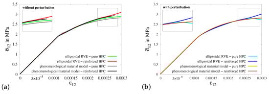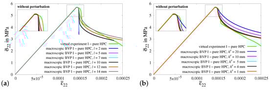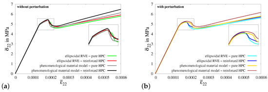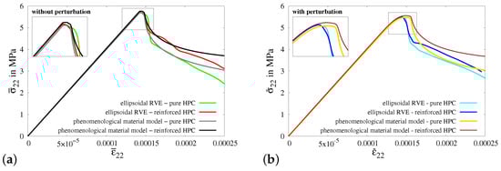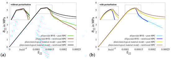 In Figure 10c, the macroscopic stress–strain characteristics for virtual experiment I using all four types of RVEs are compared, i.e., the resulting macroscopic stress–strain curves for ellipsoidal RVEs of pure HPC without perturbation (green curve) and with perturbation (cyan curve) and ellipsoidal RVEs of reinforced HPC without perturbation (red curve) and with perturbation (blue curve). The comparison of these macroscopic responses shows that the reinforced HPC RVEs (blue and red curves) have higher macroscopic stresses in the y-direction at the peak than the corresponding pure HPC RVEs (green and cyan curves). The perturbed material parameters lower the tensile strength of the concrete material. This results in RVEs with perturbation (cyan and blue curves) failing earlier than the RVEs without perturbation (green and red curves), see Figure 11c.