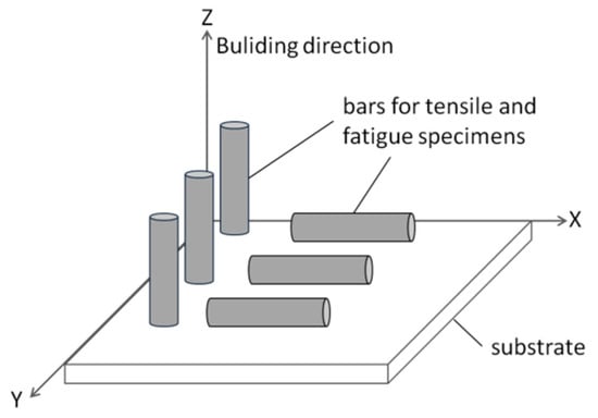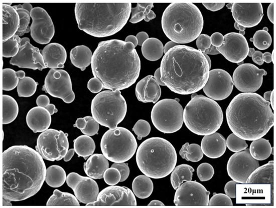 The commercial gas-atomized Hastelloy X powder was supplied by Avimetal Powder Metallurgy Technology Co., Ltd., Beijing, China. The scanning electron microscope (SEM) morphology of the powder is illustrated in Figure 1, revealing highly spherical or nearly spherical powders with a relatively smooth surface and satellite-shaped particles. The particle sizes range from 15 μm to 53 μm, and its chemical composition is shown in Table 1. The LPBF forming equipment utilized was EOS290 (EOS GmbH, Krailling, Germany). To prevent oxidation of Hastelloy X parts during the manufacturing process, a controlled argon environment was maintained within the build chamber with an oxygen concentration below 0.1%. Horizontal and vertical cylindrical bar blanks (Φ15 × 75 mm) were manufactured separately for machining tensile and HCF specimens, respectively. The scanning strategy employed was Stripe. The key process parameters are presented in Table 2. The layout of the bars on the build platform is shown in Figure 2. Following the LPBF process, these Hastelloy X bars underwent a standard solution heat treatment (SHT) at 1177 °C for 1 h in an argon atmosphere and then were cooled in argon at a rate of approximately 40 °C/min.