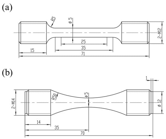 Geometry and dimensions of the (a) tensile specimen and (b) fatigue specimen (unit: mm) [2].