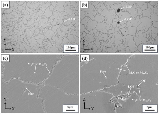 Microstructural characteristics of the LPBF-built Hastelloy X. Optical micrographs showing the morphology of the (a) XY plane and (b) YZ plane. SEM micrographs displaying carbide precipitates, as well as LOF and pore defects of the (c) XY plane and (d) YZ plane.