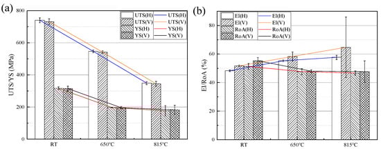 Comparison of the tensile properties at different temperatures of the LPBF-built Hastelloy X: (a) UTS and YS; (b) El and RoA.