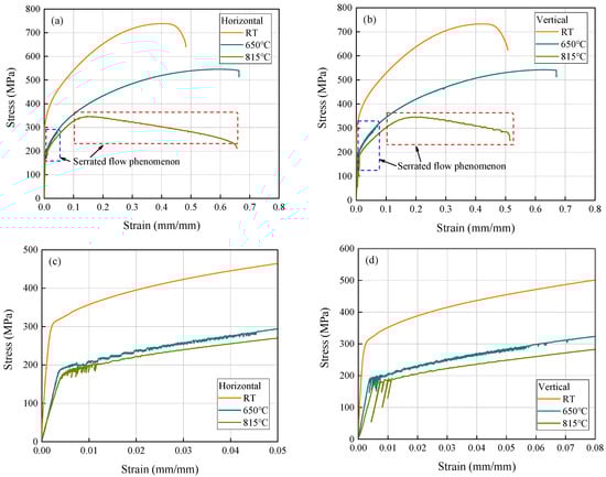 Representative room and elevated temperatures engineering stress-strain curves of the LPBF-built Hastelloy X. (a,b) Total stress-strain curves of horizontal and vertical directions. (c,d) The enlarged stress-strain curves in blue frames of (a,b).