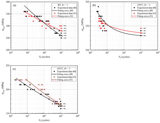 S-N curves of different directions of the LPBF-built Hastelloy X at R of −1, and temperatures of (a) RT, (b) 650 °C, and (c) 815 °C.