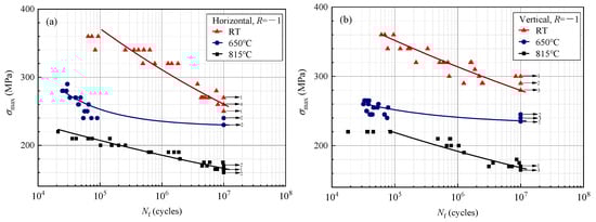 S-N curves of (a) horizontal direction and (b) vertical direction of the LPBF-built Hastelloy X.