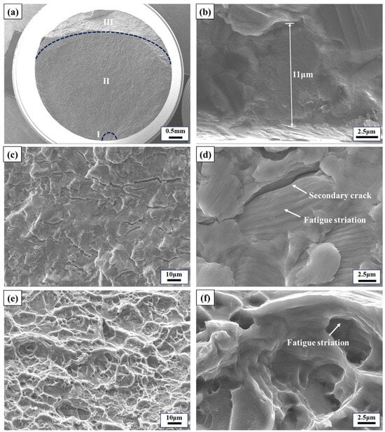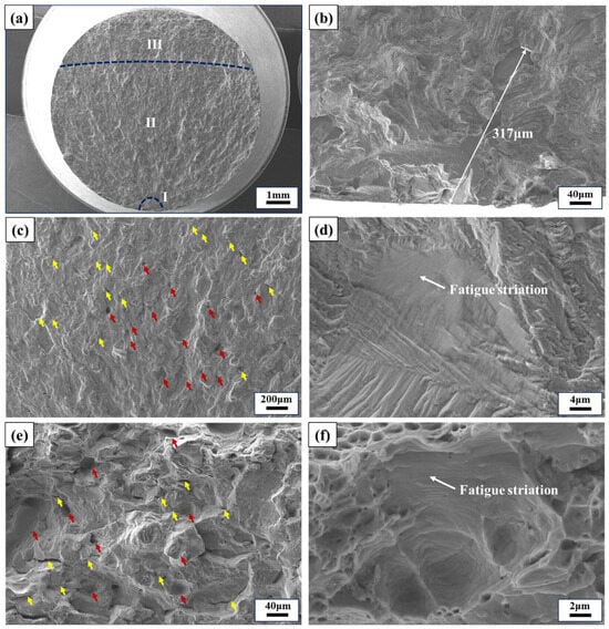 The fracture surfaces were analyzed using SEM after conducting HCF tests at room and elevated temperatures, as shown in Figure 9, Figure 10, Figure 11 and Figure 12. It was observed that the main sources of crack initiation were irregular LOF defects located on the subsurface of the specimens, with some specimens having a single LOF defect source while others had two or more. Additionally, there were no significant differences in crack-initiation sources and fracture characteristics between horizontal and vertical direction specimens, which aligns with the results obtained from the microstructure analysis and the fatigue properties testing in both directions. Figure 9 and Figure 10 depict the fracture morphologies of the horizontal and vertical specimens subjected to a test stress of 320 MPa at RT, respectively. The fracture life of the horizontal specimen was recorded as 494,200 cycles (see Figure 9), referred to as the SL specimen, while that of the vertical specimen was recorded as 1,651,500 cycles (see Figure 10), named the LL specimen. The macroscopic morphologies shown in Figure 9a and Figure 10a reveal distinct regions in both specimens, namely crack initiation (region I), crack propagation (region II), and final fracture (region III). In the crack-initiation region, the SL specimen exhibits a larger and irregular LOF defect with the longest axis size of approximately 317 μm (see Figure 9b), while the LL specimen has a smaller LOF defect with the longest axis size of about 11 μm (see Figure 10b). It is widely acknowledged in numerous relevant studies that the shape, size, and location of defects in the crack-initiation region significantly influence the fatigue life of AM alloys, and defects with more irregular shapes, closer proximity to the specimen surface, and larger sizes result in lower fatigue life [33,34,35]. In the crack-propagation region, the SL specimen exhibits numerous LOF defects (indicated by red arrows in Figure 9c), short secondary cracks (indicated by yellow arrows in Figure 9c), and fine fatigue striations (see Figure 9d). The presence of a considerable number of LOF defects within the crack-propagation region was observed across multiple specimens in this study, which not only reflects the existence of internal flaws within the alloy but also suggests that fatigue cracks tend to propagate through these LOF defects. The final fracture region of the SL specimen displays an abundance of LOF defects, secondary cracks, and dimples with varying sizes and depths (see Figure 9e). Moreover, fine fatigue striations are evident within larger dimples (see Figure 9f), indicating that, even in this critical fracture zone, the alloy retains good toughness at RT and maintains a certain lifespan. The crack-propagation region of the LL specimen exhibits minimal LOF defects, while abundant fatigue striations and secondary cracks are observed (see Figure 10c,d). The final fracture region displays numerous dimples of varying sizes and depths (see Figure 10e), with fine fatigue striations also present within larger dimples (see Figure 10f), thereby providing further evidence of the exceptional toughness of the alloy.