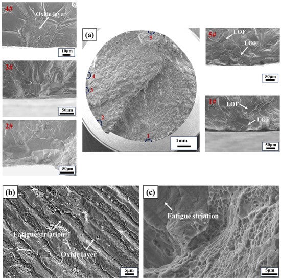 Fracture morphologies of the LPBF-built Hastelloy X specimen in the horizontal direction with conditions of 650 °C, σmax of 260 MPa, and Nf of 45,400 cycles. (a) Macroscopic morphology and the LOF defects in the crack-initiation region, (b) fatigue striations and oxide layer in the crack-propagation region, and (c) fatigue striations and dimples in the final fracture region.