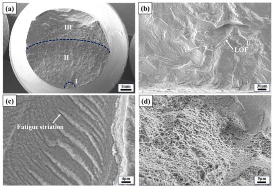 Fracture morphologies of the LPBF-built Hastelloy X specimen in the vertical direction with conditions of 815 °C, σmax of 170 MPa, and Nf of 4,486,100 cycles. (a) Macroscopic morphology, (b) the LOF defect in the crack-initiation region, (c) fatigue striations and oxide layer in the crack-propagation region, and (d) dimples in the final fracture region.