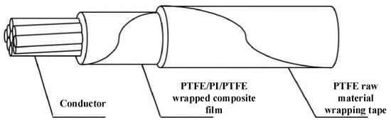 Polytetrafluoroethylene (PTFE) is a highly crystalline white thermoplastic known for its melting point of 327 °C. The molecular structure of PTFE is very symmetrical and has no branched chain. It is a linear polymer material and has no polarity between its molecules. In the crystalline state, PTFE presents a spiral structure and has a high-kneading property. At the same time, the main chain of fluorine-atom-covered-C-C bonds provides a protective shell for the carbon atom chain, which endows PTFE with excellent chemical resistance. Its strong carbon–fluorine bond also endows PTFE with an excellent high-temperature stability and an extremely high melting viscosity. PTFE can be used in a wide temperature range from −250 °C to 260 °C. It has an excellent chemical stability, electrical insulation, flame retardancy, and extremely low water absorption, and has the characteristics of being self-lubricating and non-sticky. It is widely used in switching equipment, especially as a key nozzle material in the circuit breaker arc extinguishing chamber, and its performance directly affects the breaking characteristics of the circuit breaker. In the aviation field, the use of cables is particularly critical, which requires excellent electrical insulation, high- and low-temperature resistance, thermal conductivity, flame retardancy, and wear resistance [30,31]. It is one of the mainstream manufacturing methods for high-temperature and high-thermal-conductivity aviation cables, to manufacture aviation cables using PI double-sided composite PTFE by wrapping–sintering technology. This technology takes full advantage of the high-temperature resistance of PTFE, through precision-winding and sintering processes, forming a strong and durable cable-protective layer, not only to ensure the reliability and stability of the cable at extreme temperatures, but also endowing good electrical insulation, as shown in Figure 2 [32,33].