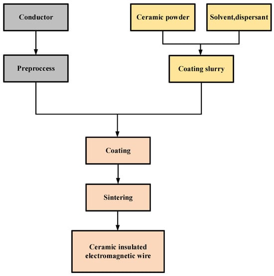 The construction of the inorganic insulation layer on the electromagnetic-wire conductor material is part of the process of preparing the inorganic insulation layer on the metal surface. At present, the methods for preparing inorganic insulating layers on metal surfaces mainly include thermal spraying, vapor deposition technology (including physical vapor deposition and chemical vapor deposition), plasma electrolytic oxidation, the sol-gel method, and the slurry sintering method. The author believes that due to the small size and low heat capacity of the substrate material of the electromagnetic wire, when the ceramic coating is prepared by thermal spraying on the surface of the wire, the thermal stress of the coating and the substrate will be large due to the fact that the heat cannot be dissipated in time; the substrate will be deformed, and the coating will crack or even fall off. At the same time, the price of thermal spraying is expensive, so there is no suitable spraying method. For vapor-deposition technology, its deposition rate is low, and it also faces the process problem of there being no deposition device for electromagnetic-wire conductor materials. The three methods of plasma electrolytic oxidation, the sol-gel method, and the slurry sintering method can use the roll-to-roll method of industrially produced wires to construct an inorganic insulating film on the electromagnetic wire substrate, which is a common method for preparing high-temperature-resistant inorganic insulating electromagnetic wires. The focus of these methods is on the selection of inorganic insulating materials and the design of slurry systems. For the selection of ceramic materials, the following four requirements should be met [69]: