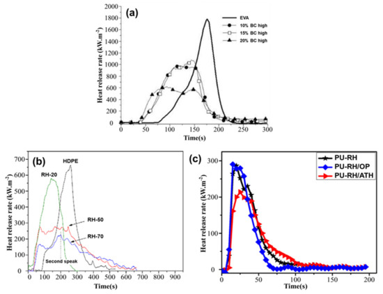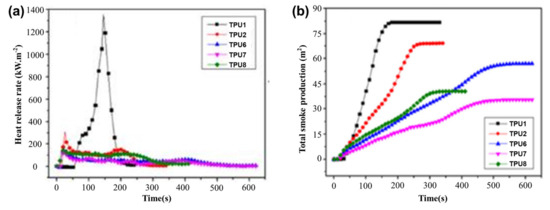 (a) HRR and (b) TSP curves of pure TPU and TPU composites. Redrawn from [31]. Copyright (2020) Wiley.