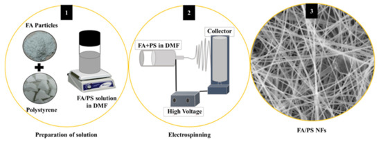 The production of the FA–PS fiber composite is shown graphically: (1) preparation of solution, (2) electrospinning and (3) SEM morphology of the FA/PS nano fibers. Redrawn from [35]. Copyright (2022) MDPI.