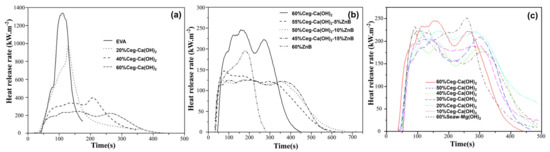 (a) HRR curves of EVA containing different content of Ceg-Ca(OH)2. (b) Evolution of the HRR during cone calorimeter test (50 kW/m2) for EVA compositions containing different combinations of Ceg-Ca(OH)2 and zinc borate (ZnB). Redrawn from [59]. Copyright (2017) Elsevier. (c) HRR curves for EVA/Ceg-Ca(OH)2/Seaw-Mg(OH)2. Redrawn from [60]. Copyright (2019) Elsevier.