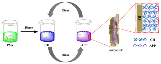 Preparation of chitosan/APP assembled bagasse. Redrawn from [67]. Copyright (2020) Wiley. Notably, PAA is polyacrylic acid.