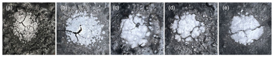 Photographs of char layers during the fire safety test: (a) sample SP-0, (b) sample SP-1, (c) sample SP-2, (d) sample SP-3 and (e) sample SP-4. Redrawn from [68]. Copyright (2022) Wiley.