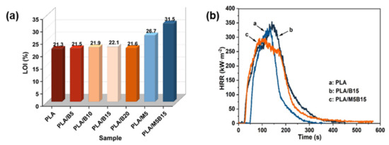 (a) LOI results of PLA composites. (b) HRR curves of PLA, PLA/B15, and PLA. Redrawn from [73]. Copyright (2022) MDPI.