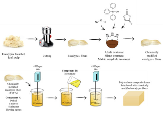 - Członka, S.; Strakowska, A.; Pospiech, P.; Strzelec, K. Effects of Chemically Treated Eucalyptus Fibers on Mechanical, Thermal and Insulating Properties of Polyurethane Composite Foams. Materials 2020, 13, 1781. [Google Scholar] [CrossRef]