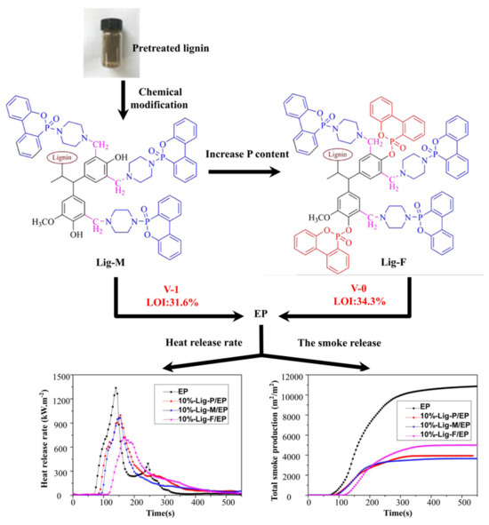 - Dai, P.; Liang, M.; Ma, X.; Luo, Y.; He, M.; Gu, X.; Gu, Q.; Hussain, I.; Luo, Z. Highly Efficient, Environmentally Friendly Lignin-Based Flame Retardant Used in Epoxy Resin. ACS Omega 2020, 5, 32084–32093. [Google Scholar] [CrossRef] [PubMed]