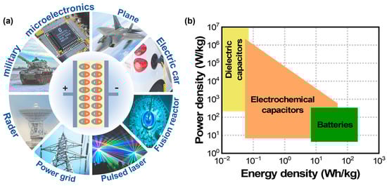 Energy storage devices such as batteries, electrochemical capacitors, and dielectric capacitors play an important role in sustainable renewable technologies for energy conversion and storage applications [1,2,3]. Particularly, dielectric capacitors have a high power density (~107 W/kg) and ultra-fast charge–discharge rates (~milliseconds) when compared to electrochemical capacitors and batteries (Figure 1b) [2,3,4,5,6,7,8,9,10,11,12,13]. These advantages of dielectric capacitors make them promising for applications in power electronics and pulsed power systems, as shown in Figure 1a. For instance, more than three trillion multilayer ceramic capacitors (MLCCs) are manufactured annually and are used in cell phones or electric vehicles [6,7,8,9,14,15]. However, dielectric capacitors have a lower energy storage density of 10−2 to 10−1 Wh/kg than electrochemical capacitors and batteries, which limits their practical applications. Therefore, high-performance dielectric materials in terms of high energy storage density, high energy efficiency, fast charge–discharge capabilities, better thermal or frequency stability, fatigue resistance, lifetime reliability, equivalent series resistance, and low manufacturing costs are needed for power electronics and pulse power applications.