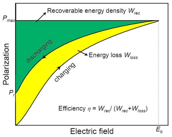 where E is the applied electric field, P is polarization, Pmax is maximum polarization, Pr is remnant polarization, and Wloss is energy loss, as schematically shown in Figure 3.