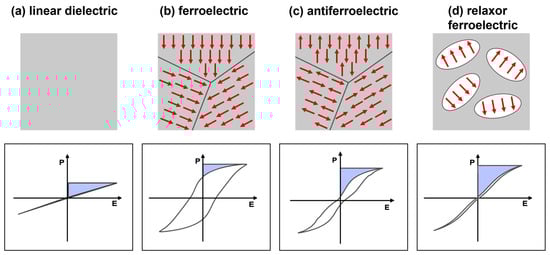 Based on polarization versus the electric field response, dielectric materials are categorized into linear dielectrics (LDs) and nonlinear dielectrics (NLDs), such as ferroelectrics (FEs), anti-ferroelectrics (AFEs), and relaxor ferroelectrics (RFEs). Figure 4a–d show a schematic of the electric field-dependent polarization response and corresponding ferroelectric domain structures with dipole orientation for the LDs and NLDs. LDs display an almost linear polarization response via the application of an electric field, owing to the lack of permanent dipoles (Figure 4a). Ferroelectric materials display superior polarization responses even in the absence of an external electric field due to the presence of a net dipole moment. Therefore, they have a strong nonlinear relation with the applied electric field (Figure 4b). In AFE materials, the adjacent dipoles are oriented in antiparallel directions, resulting in zero net polarization. They show double hysteresis loops at higher electric fields caused by AFE to FE phase transitions (Figure 4c). In RFEs, the existence of polar nanoregions (PNRs)/nanodomains greatly reduces cooperative coupling between ferroelectric domains, which limits spontaneous polarization and, consequently, slim P-E loops (Figure 4d).