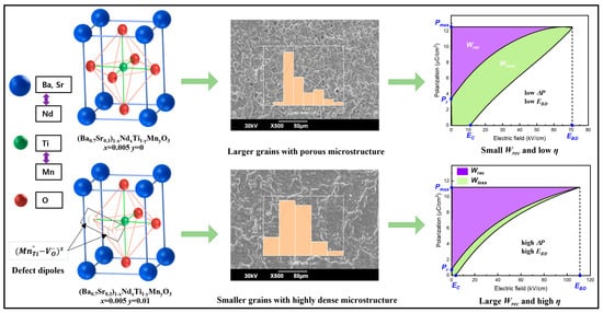 Schematic illustration of a defect dipole concept to achieve energy storage properties of Nd and Mn-co-doped Ba0.7Sr0.3TiO3 ceramics. Defect dipoles between donor/acceptor ions and oxygen vacancies capture electrons, decrease grain size, and enable a high difference between Pmax and Pr, thereby enhancing the BDS with Nd and Mn, which results in an improved Wrec and η in Ba0.7Sr0.3TiO3 ceramics. Reproduced with permission [50]. Copyright 2023, MDPI.