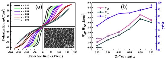 (a) P-E loops and (b) Wst, Wre, and η of the (Pb1−yLay)(ZrxTi1−x)O3 ceramics for y = 0.07 and x = 0.82 to 0.92. (c) shows a SEM image for x = 0.9. Reproduced with permission [55]. Copyright 2019, Elsevier.