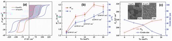 In spite of the excellent features of AFE lead-based ceramics, various AFE lead-free ceramics have garnered attention due to environmental concerns. Zhao et al. [26] reported lead-free AFE AgNbO3 (AN) ceramics with a Ta substitution to improve their energy storage properties. Figure 7 presents the P-E loops of pure, Ta-doped AN ceramics and energy storage properties of Ag(Nb1−xTax)O3 ceramics as a function of the Ta concentration (x = 0 to 20 mol%). A high Wrec of 4.2 J/cm3 (260% higher than that of pure AN) and a η of 69% were achieved in Ag(Nb1−xTax)O3 ceramics for x = 0.15. The substitution of Ta into the Nb site improves antiferroelectricity due to the lower polarizability of B-site cations, and also reduces grain size and enhances density, resulting in a high BDS of 240 kV/cm (Figure 7c). Researchers recently investigated the underlying mechanism between AFE properties and the energy barrier (EB), where increased and decreased EB for the AFE-FE phase transition via the doping of Sm3+, Ca2+, and the co-doping of Sm3+/Ta5+ at the A- and A/B-sites of AN-based ceramics, which exhibited high Wrecs of 5.2, 4.87, and 3.55 J/cm3, respectively [60,61,62]. Luo et al. [63] reported a high Wrec of 6.3 J/cm3 and a high η of 90%, realized by the M2-M3 phase boundary, the stabilized AFE phase, the presence of relaxor properties, and slim double P-E loops. In a similar way, Li et al. [5] reported 0.55(Bi0.5Na0.5)TiO3-0.45(Bi0.2Sr0.7)TiO3 relaxor-antiferroelectric ceramics with a Wrec of 2.5 J/cm3 for bulk ceramics and 9.5 J/cm3 for multilayer ceramic capacitors, respectively. In addition, Qi et al. [64,65] fabricated 0.78(Bi0.5Na0.5)TiO3-0.22NaNbO3 and 0.76NaNbO3–0.24(Bi0.5Na0.5)TiO3 relaxor-antiferroelectric ceramics with giant energy storage properties as follows: a Wrec of 7.02 and 12.2 J/cm3 and a η of 85% and 69%, respectively. Instead of the chemical substitution/composition method, Wang et al. [66] utilized a hydrothermal method to enhance the energy storage performance of AN ceramics and form a fine-grain size of 3 µm, which resulted in a high BDS of 250 kV/cm.
