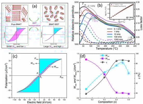 (a) Schematic of the domain structure and formation of the FE to RFE transition with the incorporation of BST into BNKT, leading to improved Wrec and η (where the red arrows indicate the dipole orientation). (b) Temperature dependence of the relative dielectric permittivity and loss factor of 0.55BNKT-0.45BST composition. The inset of Figure 8b presents the versus of 0.55BNKT-0.45BST at 1 MHz. (c) P-E hysteresis loop of 0.55BNKT-0.45BST ceramics. (d) Composition versus Wrec, Wloss, and η for x = 0.15–0.50. Reproduced with permission [100]. Copyright 2023 MDPI.