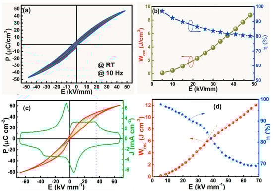 Wrec and η are the most important parameters for evaluating the energy storage performance of dielectric materials, which are related to dielectric permittivity and polarization. A high Wrec of dielectric materials means that more energy can be stored in a given volume, promoting miniaturization and lightweight and low-cost materials being utilized in consumer power electronics and pulse power systems. It can be concluded from Equations (4)–(7) and Figure 3 that a higher εr, Pmax, and BDS lead to higher energy density, whereas low dielectric or hysteresis losses and low Pr improve energy storage efficiency in dielectric materials. Moreover, the material should have low electronic or ionic conductivity to resist higher electric fields.