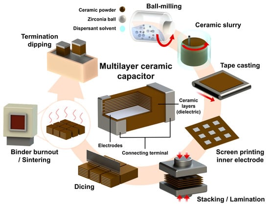 MLCCs have been fabricated using the tape-casting technique, which has two main advantages as follows: (i) The MLCC layers offer low porosity and a fine grain size, leading to a high Eb. (ii) A higher Eb is expected in the MLCC compared to conventional ceramic capacitors because the Eb increases with the decreasing layer thickness. The fabrication process of the MLCCs entails various stages, such as ball milling, slurry formation, tape casting, screen printing, stacking/lamination, dicing, sintering, and termination dipping. Figure 10 presents a schematic illustration of the MLCC fabrication process [187,188]. The ceramic powders were ball milled, slurry dried, and calcined. This calcined powder was re-milled with a dispersant (ethyl methyl ketone), binder (poly(propylene carbonate)), and plasticizer (butyl benzyl phthalate). Furthermore, a slurry was used to prepare thick films using a tape-casting process. The films were stacked layer by layer with inner printed Pt electrodes and then sintered at the desired temperatures to obtain the MLCCs. Lastly, the sintered samples were polished to terminate the opposite ends of the MLCC, and silver paste was coated to form the outer electrodes for electrical characterizations.