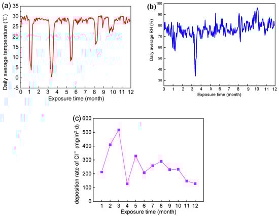 Figure 2. Environment factor of exposure site during the exposure time: (a) temperature, (b) relative humidity, and (c) chloride ion deposition rate [17].