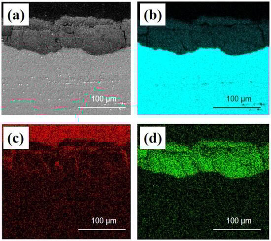Figure 6 displays the EDS analysis of the cross-section of AZ91 Mg alloy exposed for 1 year on the deck of the Research Vessel KEXUE. After exposure for 12 months, the corrosion product layer with a thickness of more than 90 µm formed on the surface of the samples. The O element was mainly concentrated on the corrosion product layer, which indicated that the corrosion product layer formed on AZ91 magnesium alloy was composed of oxide. It can also be seen that there were some small cracks in the corrosion product layer, and the C element was concentrated in these cracks. This is mainly due to the thin electrolyte layer formed on the surface of specimens. CO2 in the air and dissolved in the thin electrolyte layer could permeate into these cracks and generate carbonate-containing compounds [24,25]. In high relative humidity environments, the electrolyte solution formed on the surface could penetrate into the substrate surface through cracks, promoting further corrosion.