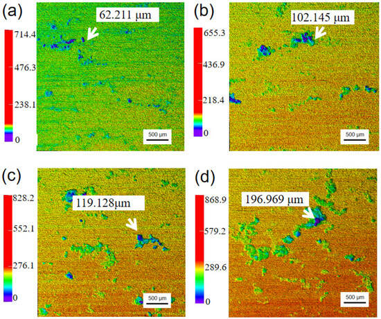 Figure 7. Laser confocal scanning microscopy (LCSM) of AZ91 magnesium alloy specimens without corrosion products exposed for different periods: (a) 1 month, (b) 3 months, (c) 6 months, (d) 12 months.