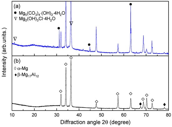 Figure 8. XRD patterns of AZ91 magnesium alloy with: (a) corrosion products, (b) matrix.
