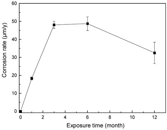 The variation curve of the corrosion rate of AZ91 Mg alloy on the deck of Research Vessel KEXUE after 1 year of exposure is shown in Figure 10. In the first three months of exposure, the corrosion rate rapidly increased with an approximately consistent slope. The corrosion rate in three months reached as high as 48.08 μm/y. The corrosion rate remained stable for the next three months, and after six months of exposure, the corrosion rate of the sample gradually decreased with the passage of exposure time. After 12 months of exposure, the corrosion rate of the sample was 32.50 μm/y. The reason for this is speculated to be the more positive potential of the second phase (β-Mg17Al12) compared to the matrix phase [31], resulting in micro-galvanic corrosion. After 3 months, the micro-galvanic corrosion and the hindrance of the second phase reached equilibrium, and the corrosion rate remained unchanged. After 6 months, with the dissolution of the matrix phase, the relative proportion of the second phase increased, and its hindrance became more obvious. The thick corrosion product film also hindered the infiltration of chloride ions, resulting in decreasing the corrosion rate of AZ91 Mg alloy.