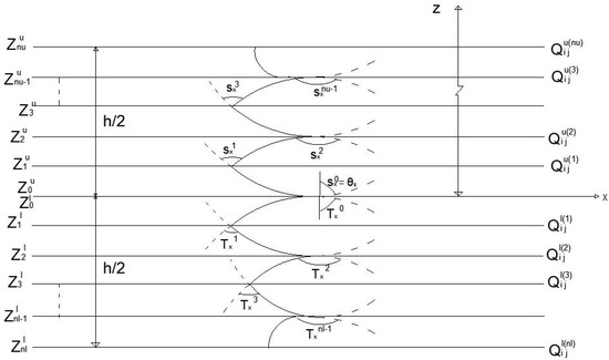 Equations (3) and (4) represent in-plane displacements in the x and y direction, respectively [42]. Where {u0} represents the in-plane displacement of any points on the central surface of the plane, and nu and nl represent the number of upper and lower surfaces of the plane. The slopes of the ith layer for upper and lower surfaces are represented by , , , respectively. the unidentified higher-order terms are , , , . The unit step expressions are , and the subscripts 1 and 2 denote the coordinate axes (i.e., in these functions).