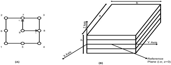 (A) Nine noded iso-parametric element. (B) Plate with four layers and simple support.