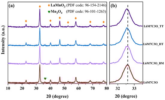 For optimal catalytic activity, symmetrical crystal structures in the metal oxide are desired. These configurations facilitate the interaction between the reactants and M site cations, which are the active sites for the ORR. X-ray diffraction (XRD) was employed to characterize the crystalline structure of the metal-oxide–perovskite-type materials. The L6M7C3O_Mortar sample was excluded as mortar mixing is known to not alter the crystal structure [40]. Figure 1 displays the XRD patterns obtained for the perovskite-based materials showing peaks at 2θ = ~23, 33, 40, 47, 58, and 68°, which correspond to the (0 1 0), (0 1 1), (1 1 1), (0 2 0), (1 2 1), and (0 2 2) planes. These peaks can be indexed to a cubic perovskite phase LaMnO3 belonging to the Pm-3m space group (PDF code: 96-154-2146). The results confirm the successful incorporation of cobalt into the LaMnO3 crystal structure since no other cobalt oxides are detected. A magnification of the XRD signal in the region 32–33° (Figure 1b) reveals a slight shift in the diffraction peak towards lower values of 2θ in the samples mixed with carbon, compared to the pure perovskite (L6M7C3O). Despite this, the lattice parameter of the perovskite remains largely unaffected upon incorporation of the carbon material. On the other hand, the formation of La vacancies in the perovskite promotes the formation of M-cation species, such as manganese oxides [51]. The small peak at around 36° indicates the existence of the Mn3O4 oxide which has a tetragonal phase and belongs to the I41/amd space group (PDF code: 96-101-1263).