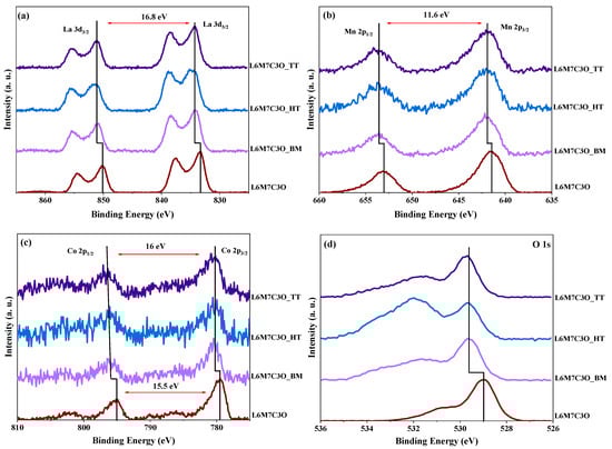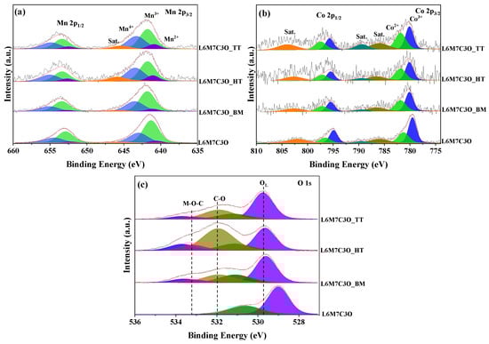 Figure 4b shows the deconvoluted Co 2p spectra. The Co 2p3/2 and Co 2p1/2 signals are divided into two peaks assigned to Co3+ (at 779.8 and 794.8 eV) and Co2+ (at 781.2 and 796.2 eV) [66]. Table 2 shows variations in the Co3+/Co2+ ratio, with an enrichment of Co2+ compared to Co3+ in the L6M7C3O_HT and L6M7C3O_TT samples. This effect results from the increase in Mn4+ species on the surface, which provokes the reduction of Co3+ species to Co2+ to keep the electroneutrality on the metal surface.